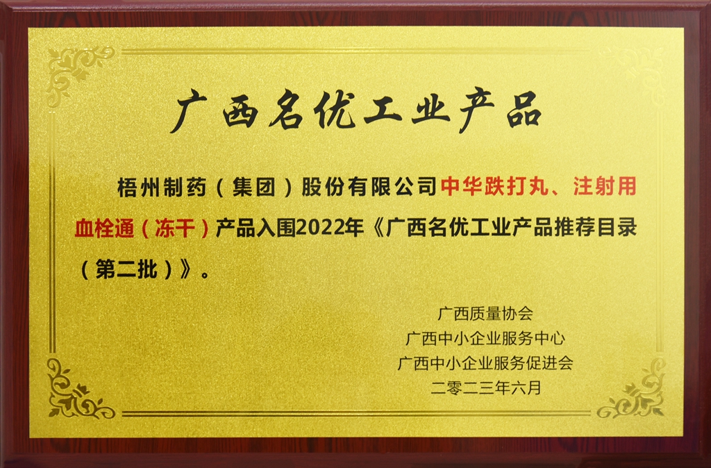 廣西梧州制藥(集團(tuán))股份有限公司中華跌打丸、注射用血栓通(凍干)產(chǎn)品入圍2022年《廣西名優(yōu)工業(yè)產(chǎn)品推薦目錄(第二批)》